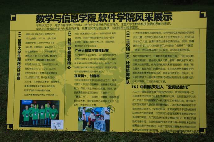 本次摆摊活动主要由数学与信息学院、软件学院团委学生会、校友分会、ACM队伍、计算机维护队、科创·竞赛服务中心进行风采展示活动。学院结合中国航天新发展这一热点进行了丰富多样、饶有趣味的展示活动,贴合学院特色以及部门特点,如ACM队伍的程序设计比赛和我院校友分会承办的IT农场中开发的游戏展示等等。