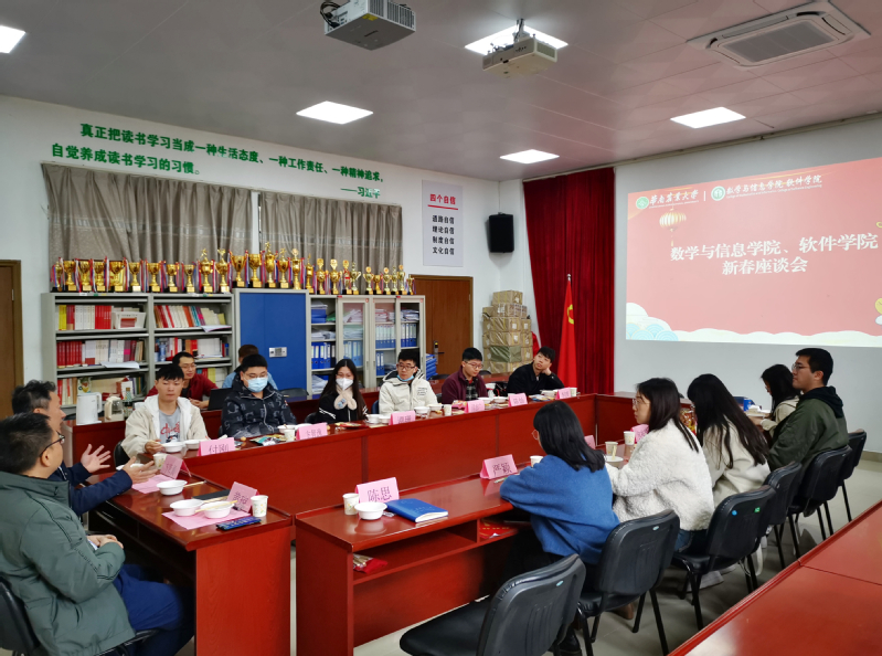 1月15日,正值中国农历小年佳节,迎详纳福之际,我院在院楼218举行寒假留校学生迎新春茶话会,师生欢聚一堂、互赠祝福、喜迎新春。数信学院院长黄琼,党委副书记方育阗,辅导员陈思老师、余丹华老师、黄经纬老师、严颖老师以及春节留校学生参加茶话会。