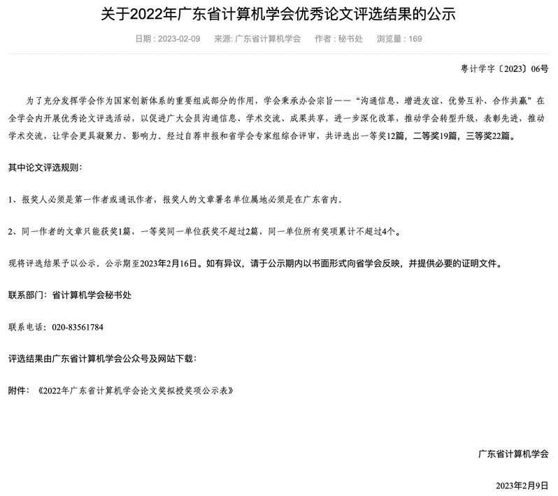 图2. 2022年广东省计算机学会优秀论文奖公示情况