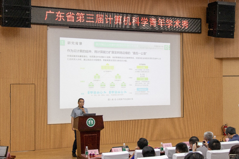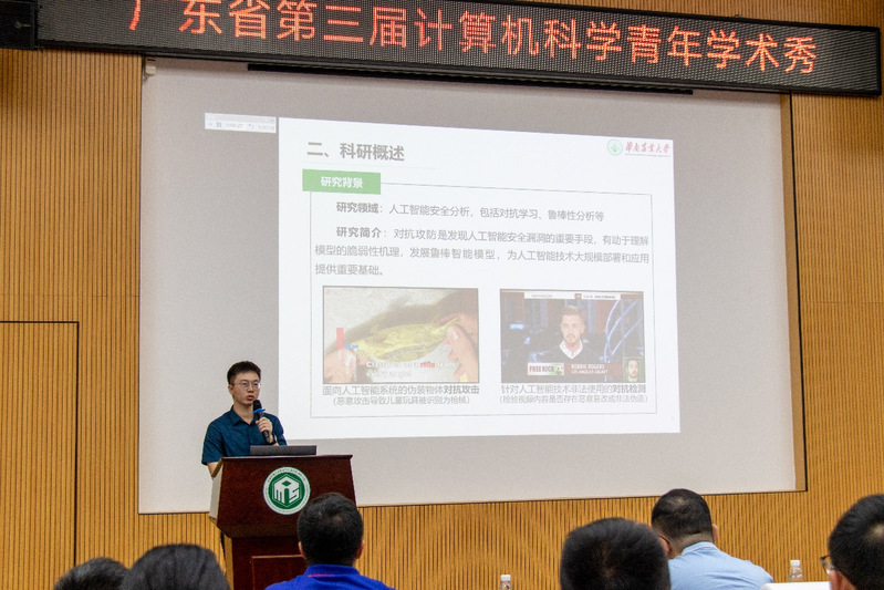 在现场演讲比赛环节,来自广东省十所高校的16位青年教师从人工智能安全、计算机视觉、迁移学习、因果关系发现、智能规划、图挖掘、群体智能、对抗学习、边缘计算、区块链等多个研究领域展示了各自在理论、方法与实践等层面的研究成果。其中,青年教师黄立峰博士和罗浩宇博士代表我院参加比赛,并作了精彩的学术演讲。