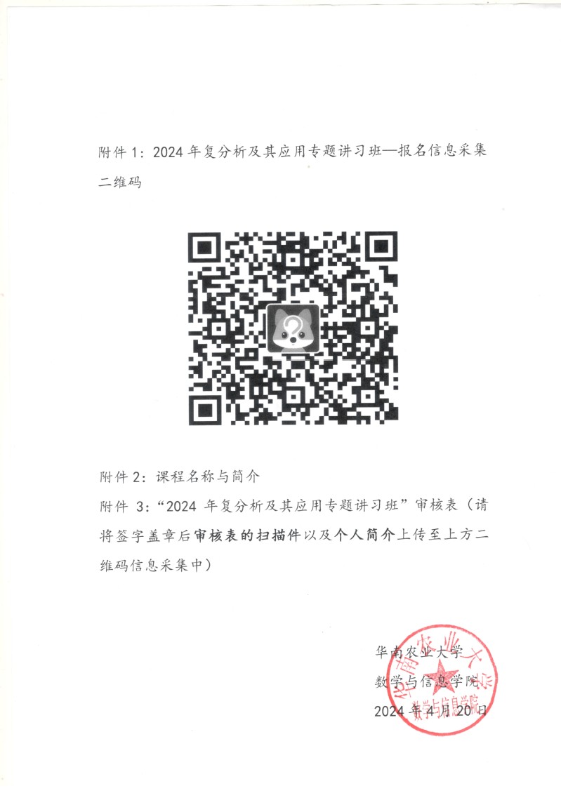 由国家自然科学基金委数学天元基金项目资助的“2024复分析及其应用专题讲习班”将于2024年6月30日至7月20日在华南农业大学举办。本次讲习班将开设4门复分析及其应用的专题课程,拟邀请知名专家作专题学术报告。