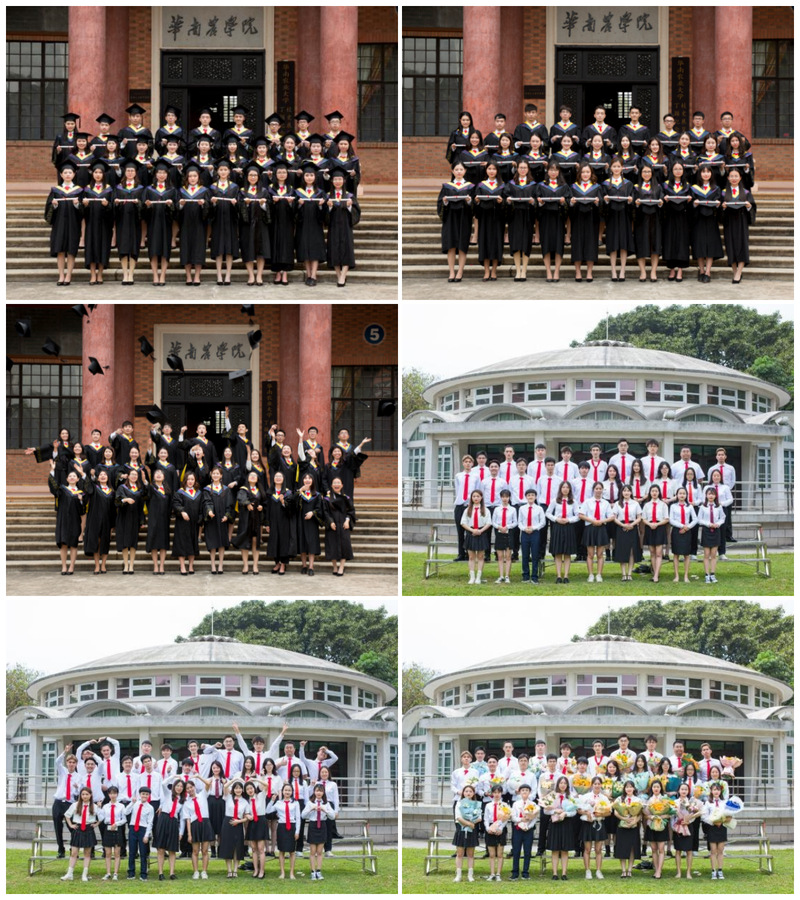 拍完专业照的班级迅速离开行政楼到红满堂/校史馆拍班级照,班级正装合影在红满堂前面,穿学士服的3款镜头在校史馆最上面台阶拍摄,班级照提前20分钟到场集合(现场有指示牌)有工作人员帮忙集理整队,拍完正装合影的班级马上移步到校史馆台阶拍摄学士服班级合影。