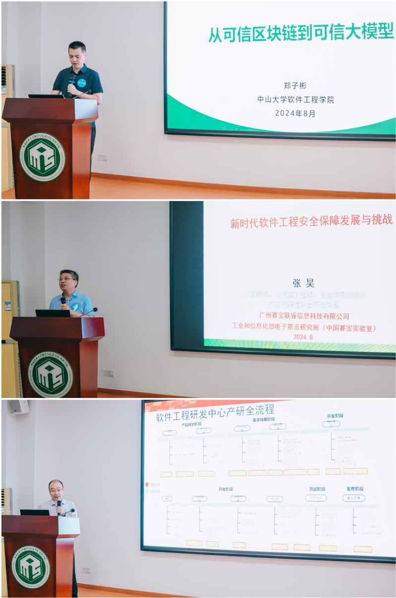 会议的第二部分是学术报告会环节。软件工程专业作为培养未来软件行业专门人才的重要基地,其教育教学模式的创新与改革显得尤为重要。产学研协同已成为提升教育质量、促进科研成果转化、增强学生实践能力和创新能力的重要途径。本次会议邀请到了高校、研究所和高新企业的三位杰出专家,分别从产、学、研多维度、多视角对软件工程领域的研究与发展给出精彩报告。中山大学软件工程学院院长郑子彬教授以“从可信区块链到可信大模型”为题,介绍了区块链与大模型的热点研究问题。工业和信息化部电子第五研究所的张昊正高级工程师以“新时代软件工程安全保障发展与挑战”为题,对软件工程领域信息安全保障进行了深入讲解。普华基础软件有限公司曹捷博士以“大模型时代下的软件工程研发中心”为题,从产业一线的角度介绍了大模型对软件研发的影响。现场讨论氛围热烈。