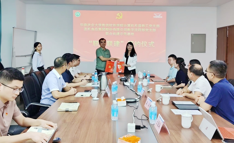 为充分发挥全国党建工作样板支部服务地方经济发展、助力乡村振兴的示范引领作用,实现资源共享、优势互补、创新发展,近日,华南农业大学数学与信息学院计算机应用教工党支部与温氏食品集团股份有限公司数字流程部党支部开展了“联学联建联创 助力乡村振兴”主题党日活动。学院党委书记陈文艺、院长黄琼、计算机应用教工党支部书记王金凤,温氏集团数字流程部总经理蒋荣金、支部书记温志顺及支部骨干成员等参加活动。
