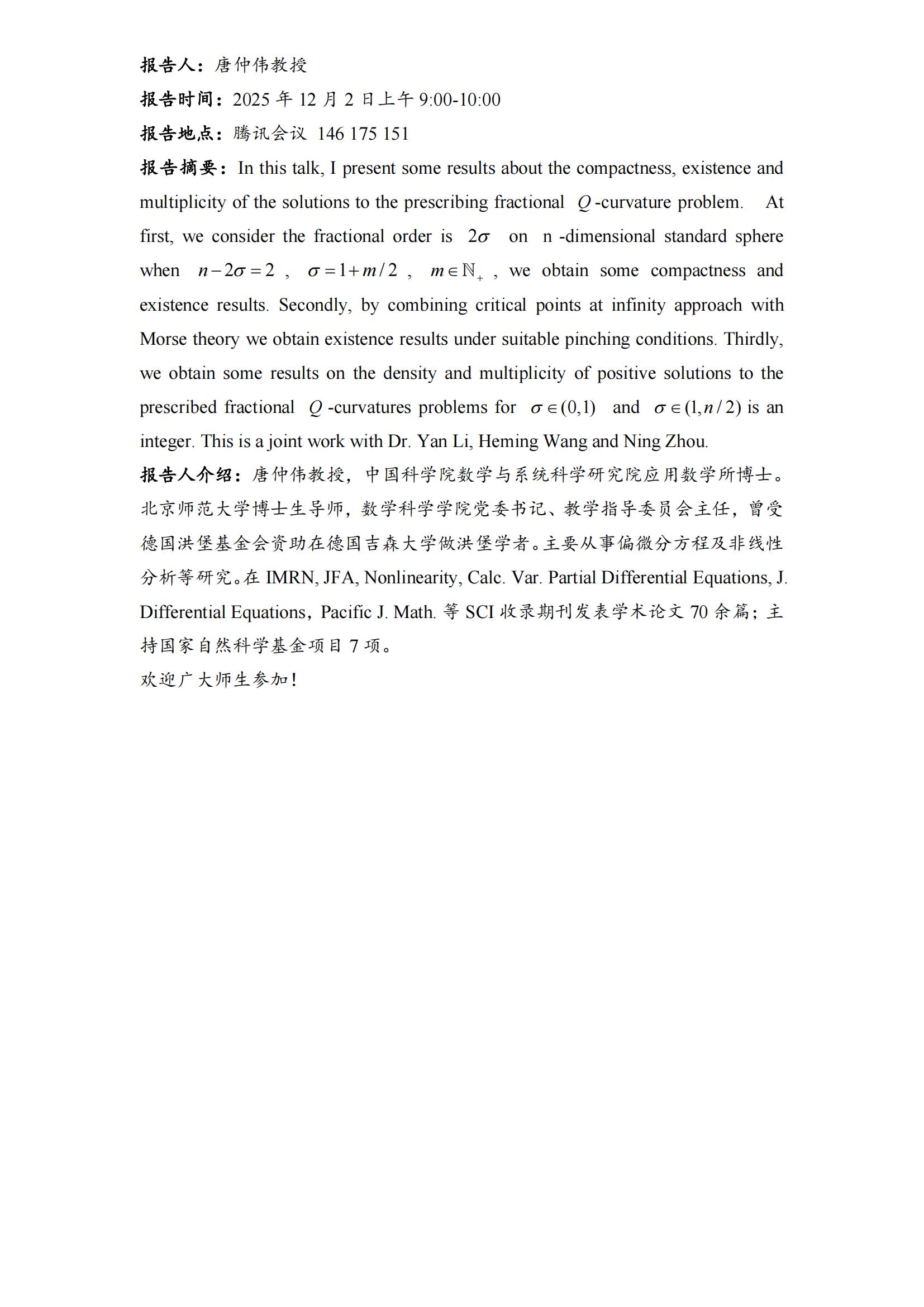 学术报告:Some recent results related to the prescribed fractional Q-curvatures problems