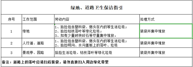 五、劳动内容:针对办公楼周边及中庭、校内主要道路周边绿地、人行道(不包含道路)和公共活动场所、绿地等区域,开展电动车摆放、生活垃圾捡拾清扫(绿地中的白色垃圾)、积水清理、落叶清理(人力可及范围内枯枝,大型树枝不包括)等义务劳动,确保负责片区内无违规停放电动车,无果皮纸屑、包装袋等垃圾,无杂物堆放、积水死角及其他环境卫生问题。捡拾清扫的生活垃圾集中分类投放到就近的垃圾分类收集箱,不方便清运的枯枝落叶、杂草、砖石块等非生活垃圾杂物应整理成堆,再装入大垃圾袋中,最后将所有大垃圾袋集中堆放在一个路边的垃圾桶旁。由后勤处安排收集运输。(相关工作指引详见附件1)