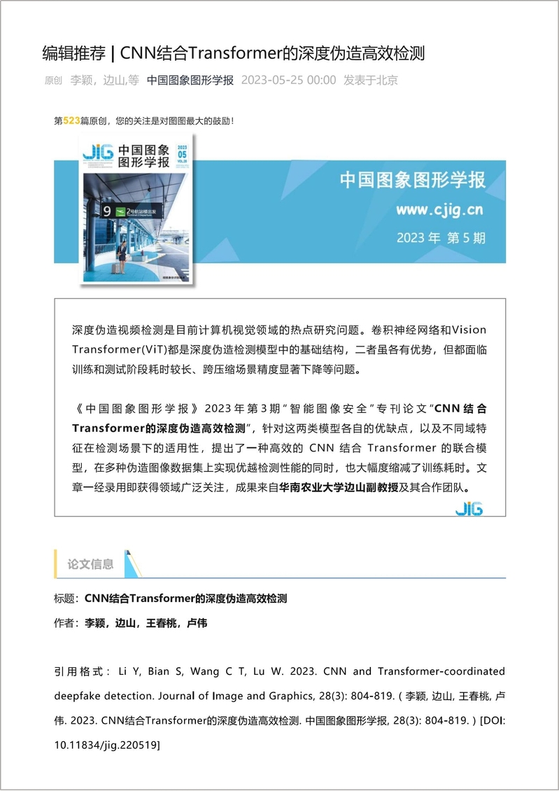 近日,我院计算机科学与工程系边山副教授和研究生李颖等人的学术论文“CNN结合Transformer的深度伪造高效检测”在《中国图象图形学报》2023年第3期发表。该文章获得相关领域学者的广泛关注,论文访问量为当期排名第一,为此学报专门制作了推荐专题,在中国图象图形学报公众号中进行推送和宣传。 该论文针对现有深度伪造检测方案在跨压缩率、跨库检测场景下检测...