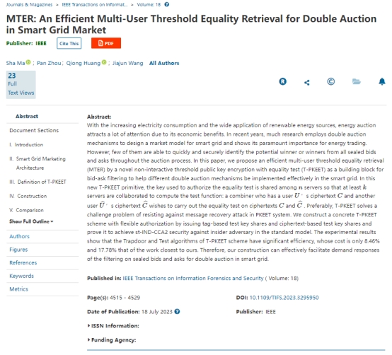 近日,我校数学与信息学院、软件学院网络空间安全研究团队马莎副教授和黄琼教授在IEEE Transactions on Information Forensics and Security(CCF A类推荐期刊,中科院计算机科学一区Top期刊,最新影响因子6.8)发表了题为“MTER: An Efficient Multi-User Threshold Equality Retrieval for Double Auction in Smart Grid Market”的研究论文(论文链接为https://ieeexplore.ieee.org/document/10186375)。 图1 论文首页截...